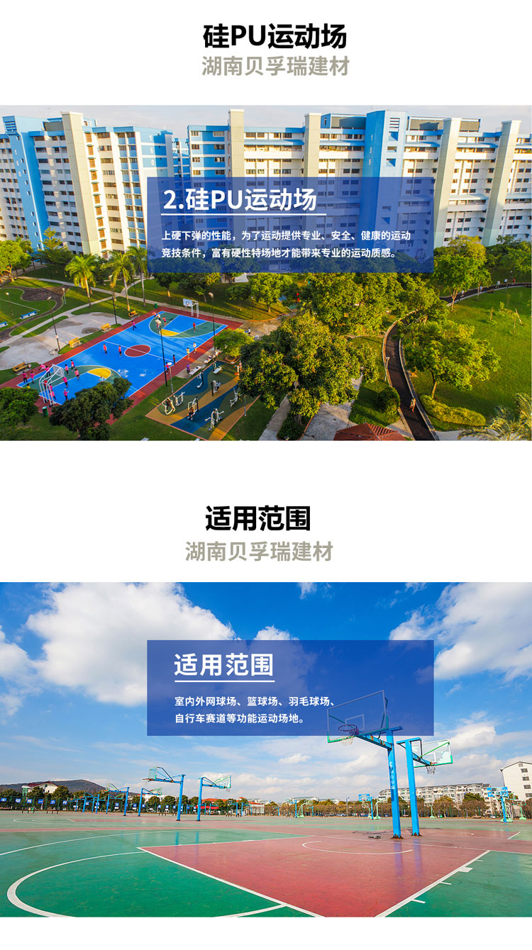 、超強的耐磨性:硅PU面層采用添加硅樹脂顆粒做法,其結(jié)構(gòu)特征恒久穩(wěn)定不變,軟硬適中,耐磨性能滿足長期高使用頻率的需要。